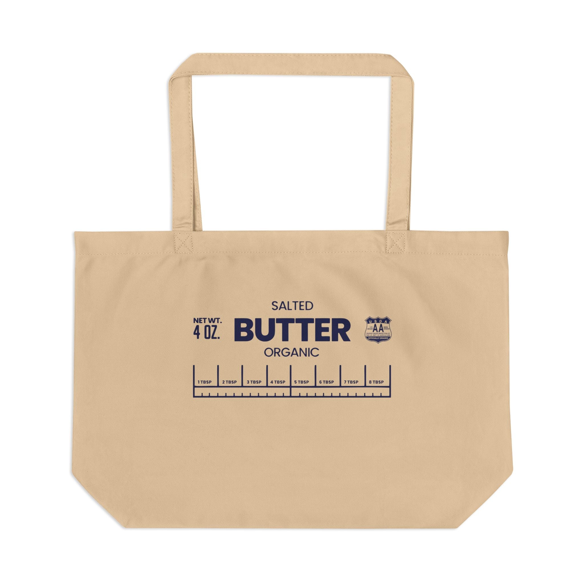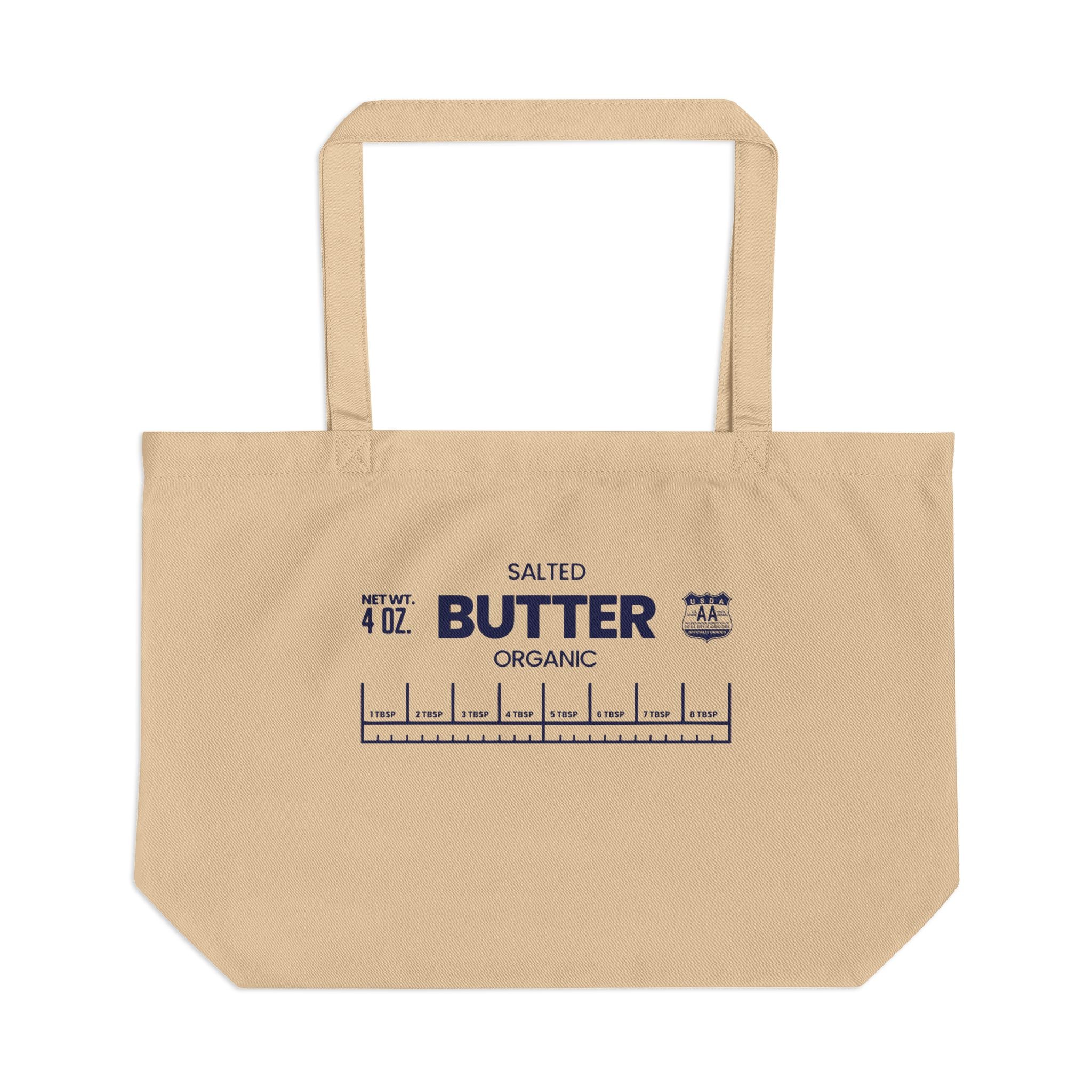 This roomy eco tote blends everyday utility with a calm, homey charm. Made from heavy organic cotton twill, it carries groceries, farmers’ market finds, and baking supplies with a flat-bottom stability that keeps jars and produce upright. The minimalist “BUTTER” graphic and subtle ruler detail give it a quietly playful kitchen vibe — like a familiar label from a well-loved pantry. It sits comfortably over the shoulder on long self-fabric straps and holds up to 30 lbs, so it’s as useful for weekend markets as it is for carrying a pie to a friend’s house. Certified organic, OEKO‑TEX and PETA‑approved, this tote quietly signals thoughtful, sustainable living while staying wonderfully functional.