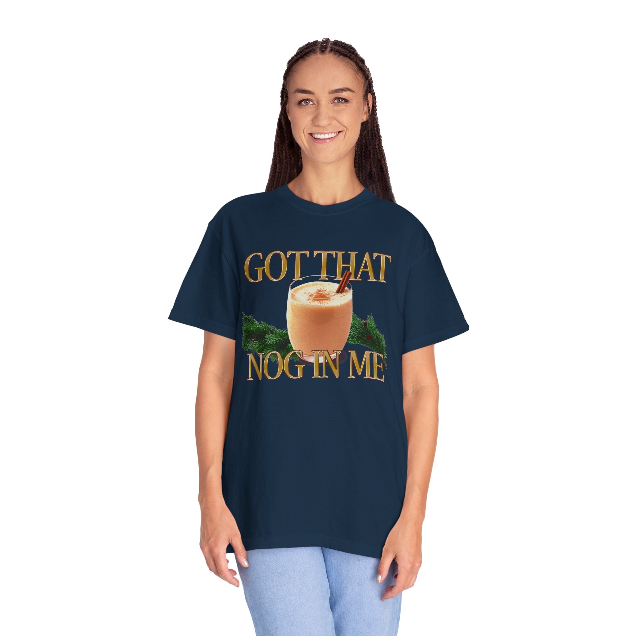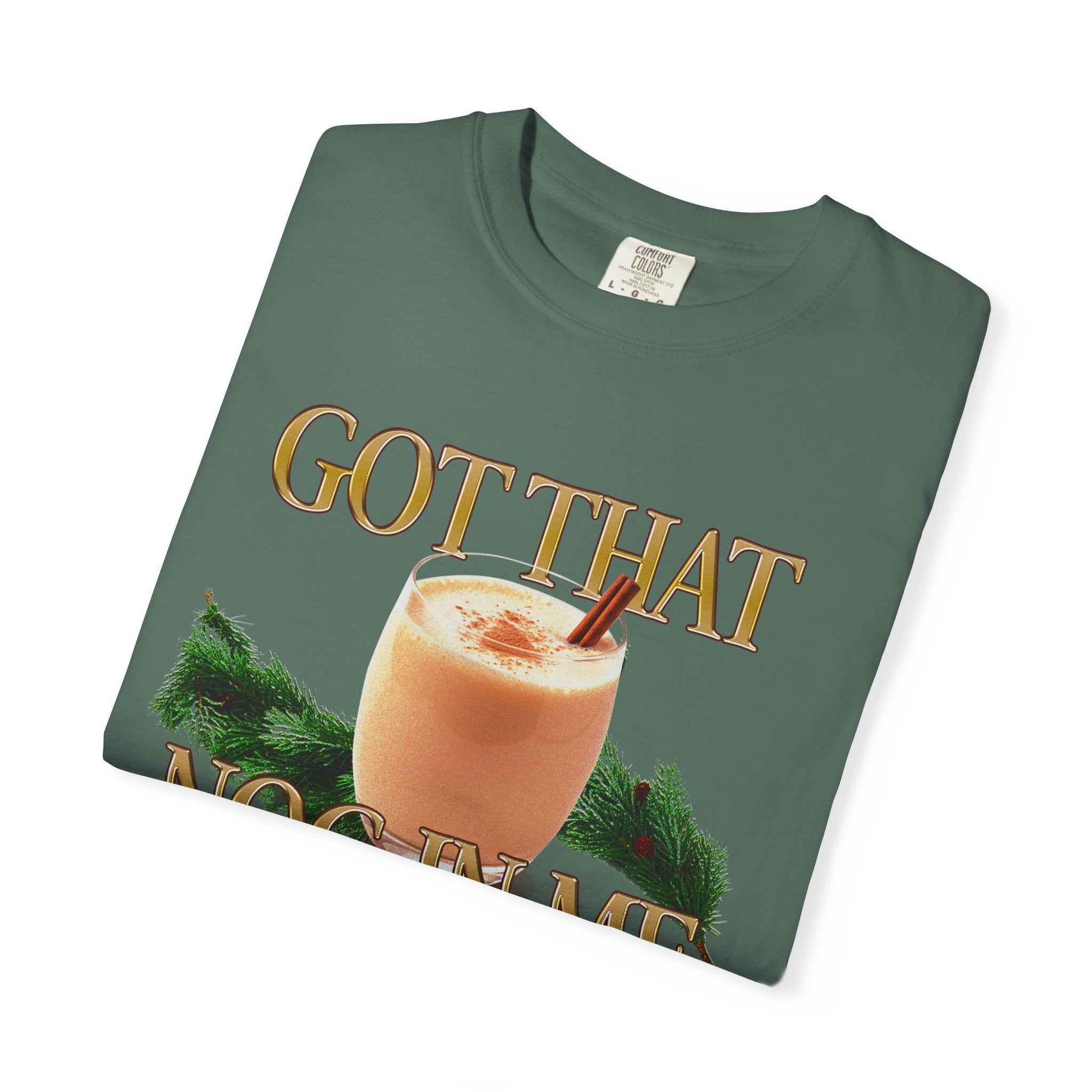 This relaxed-fit garment-dyed tee brings cozy holiday vibes into everyday wear. A vintage-style eggnog glass sits centerstage, cinnamon stick and all, framed by soft evergreen sprigs and warm, retro lettering that reads “GOT THAT NOG IN ME.” The medium-weight, pre-shrunk 100% ring-spun cotton feels broken-in from day one thanks to the after-construction dyeing process — the color and texture deepen with every wash. Wear it to casual gatherings, tree-lighting nights, or while stirring a pot of seasonal treats; it’s an easy, low-fuss piece that reads like a comfy inside joke with friends and family. Subtle worn-in edges and double-needle stitched seams keep it looking lived-in and lasting through holiday seasons to come.